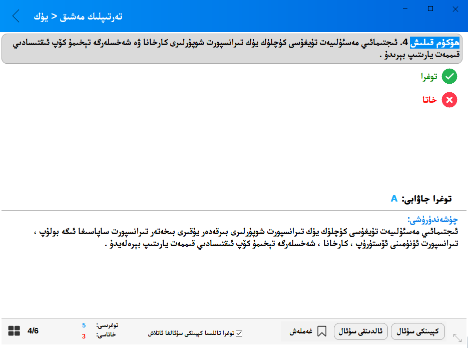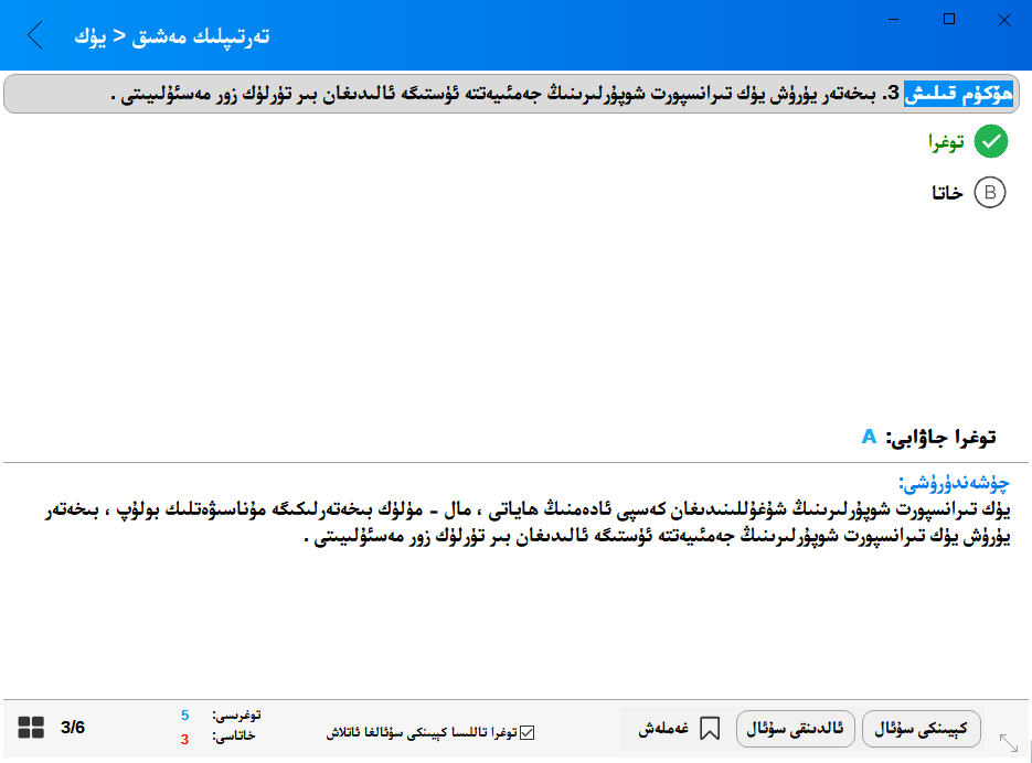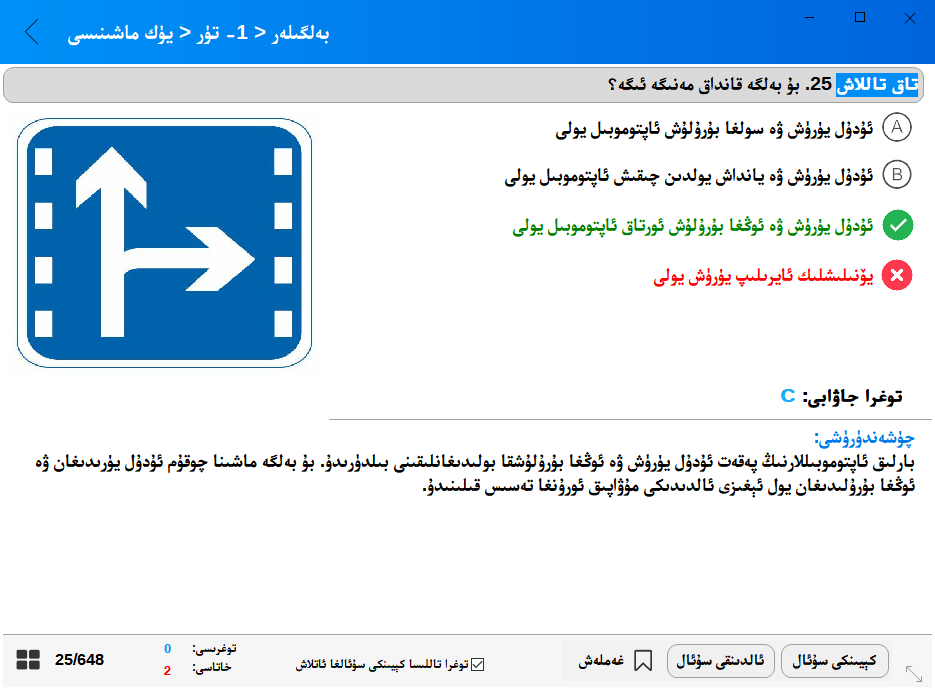 ھەر بىر سۇئالغا ئىزاھات قوشۇلغان بولۇپ، شوپۇرلۇق نەزىرىيە ئۆگەنگۈچىلەرنىڭ قېيىن سۇئاللارنى چۈشىنىشى ئاددىيلاشتۇرۇلغان. شوپۇرلۇق نەزىرىيە بىلىملىرىنى مۇئەللىمسىزمۇ ئۆگەنگىلى بولىدۇ.
