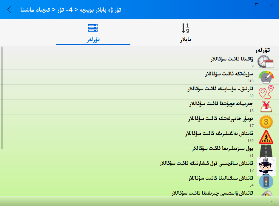 شوپۇرلۇق پىراۋىسى ۋە كەسپكارلىق سالاھىيەتنامىسىگە مۇناسىۋەتلىك بارلىق سۇئاللار كىرگۈزۈلگەن بولۇپ، شوپۇرلۇق پىراۋىسىنىڭ ئاپتوبۇس، يۈك ماشىنىسى، كىچىك ماشىنا، موتوسىكلىت پىراۋىسى ئېلىشقا مۇناسىۋەتلىك 1- تۈر (باش نەزىرىيە)، 4- تۈر (ئاخىرقى نەزىرىيە) نەزىيە ئىمتىھان سۇئاللىرى شۇنداقلا كەسپكارلىق سالاھىيەتنامىسىغا مۇناسىۋەتلىك بولغان يۈك، يولۇچى تاكسى، خەتەرلىك بويۇم، تېرىنىر قاتارلىق نەزىرىيە بىلىملىرى تولۇق كىرگۈزۈلدى ، سىزنىڭ شوپۇرلۇق بىلىملىرىنى ئۆگىنىش ئىھىتىياجىڭىزدىن تولۇق چىقىدۇ.